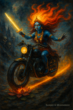 She is the fierce mother of time, the dark flame of truth, the chaos-cleanser, the ego-eraser. And when it comes to riding, Kali isn’t just a passenger — she’s the force that teaches you to ride without fear, ego, or illusion.