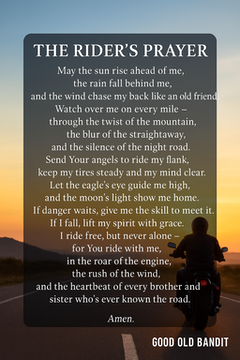 #RidersPrayer #BikerBlessing #RideSafe #OpenRoadSpirit #FreedomRide #MotorcycleLife #TwoWheelsOneSoul #BikerFaith #GoodOldBandit #RideWithPurpose #BrotherhoodOfRiders #WindTherapy #RoadWarrior #LiveToRide #RideFree